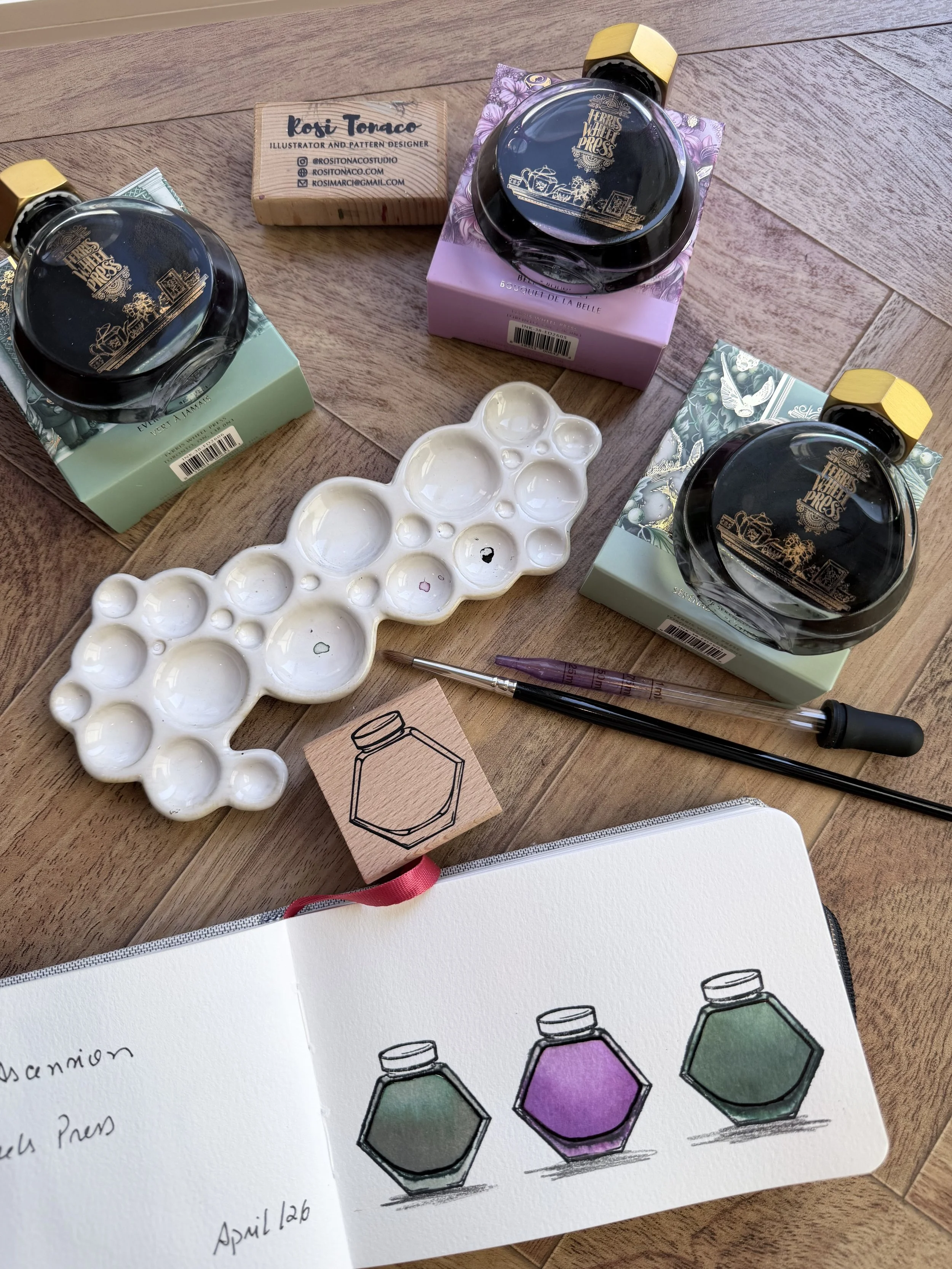 I've been swatching new ink colors using bottle stamps, and it's such a cute and fun way to build my color reference collection. The idea is wonderfully simple — I stamp tiny ink bottles on the page and then swatch the actual color inside each one. The result has this enchanting, almost apothecary-style aesthetic that I absolutely love.