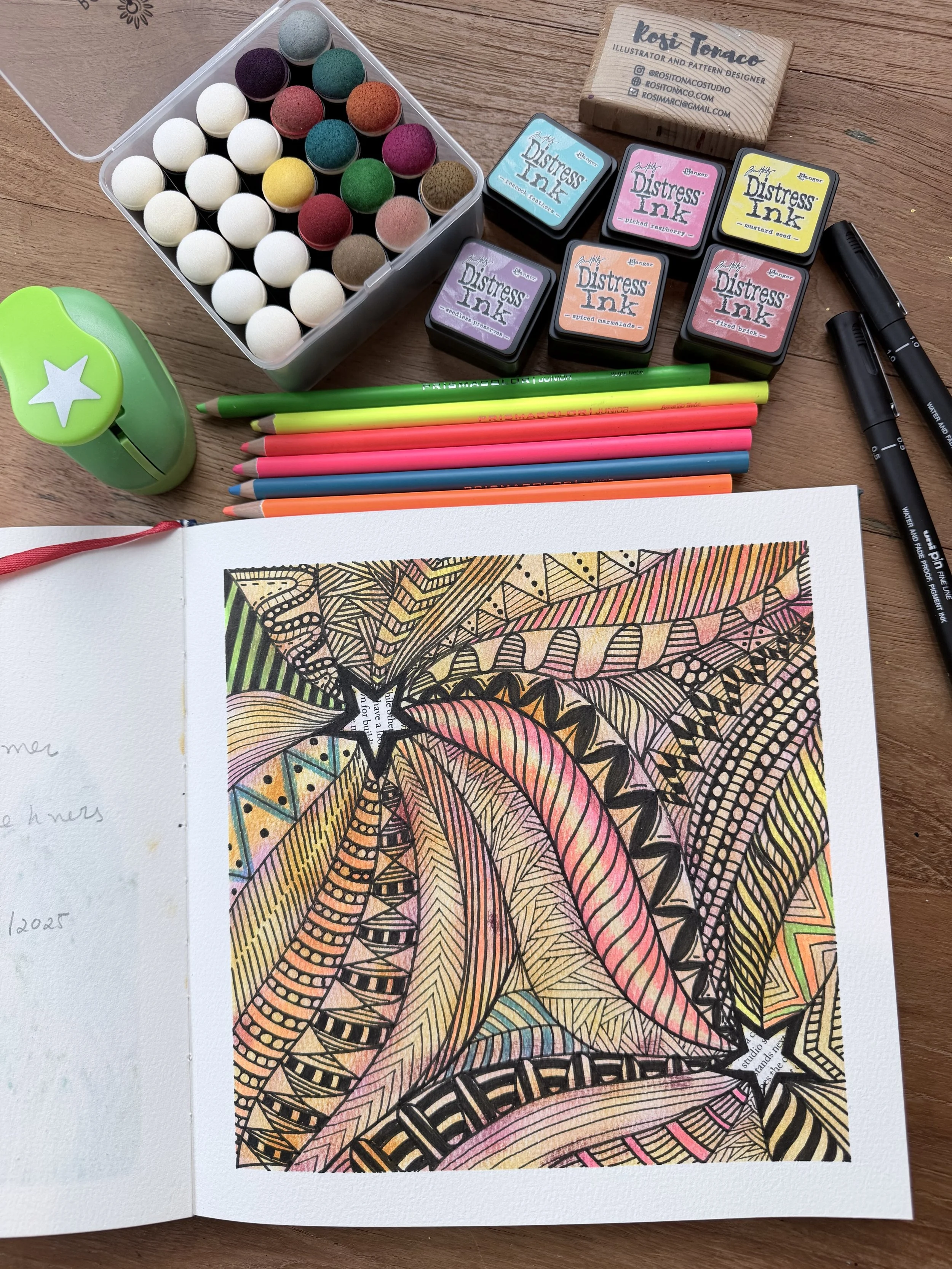 I started with some heavy text magazine pages, then used a paper punch to cut out a few stars, drew some wavy lines with a fine liner, and added color using distress ink and finger foam brushes. Then came my favorite part — filling the waves with zentangle patterns and adding more color with neon colored pencils. It's fun, simple, and so satisfying to watch it all come together.